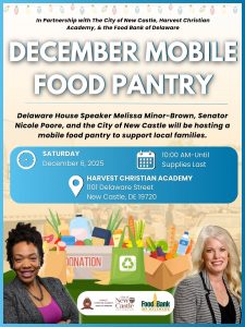 Delaware House Speaker Melissa Minor-Brown, Senator Nicole Poore, and the City of New Castle will be hosting a mobile food pantry to support local families.